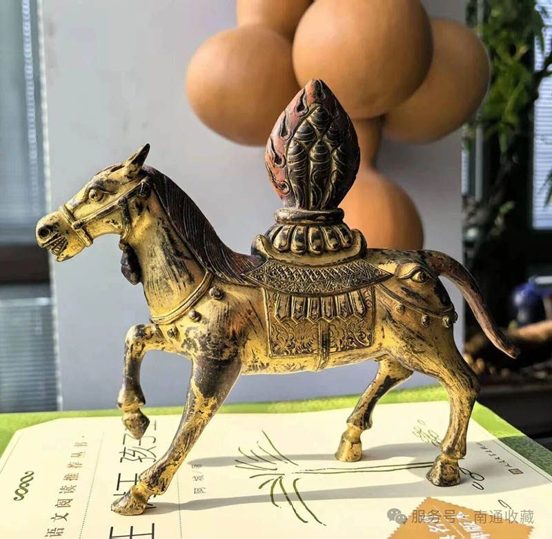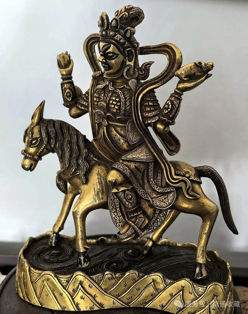 一尊是黃銅鑄的“馬上有財”。馬身鎏金,已磨出溫潤的啞光,鞍上坐著藏地財神,面容憨厚,四蹄踏在波紋底座上,像踩碎了雪域高原的湖水,漣漪凝成銅銹的青綠。